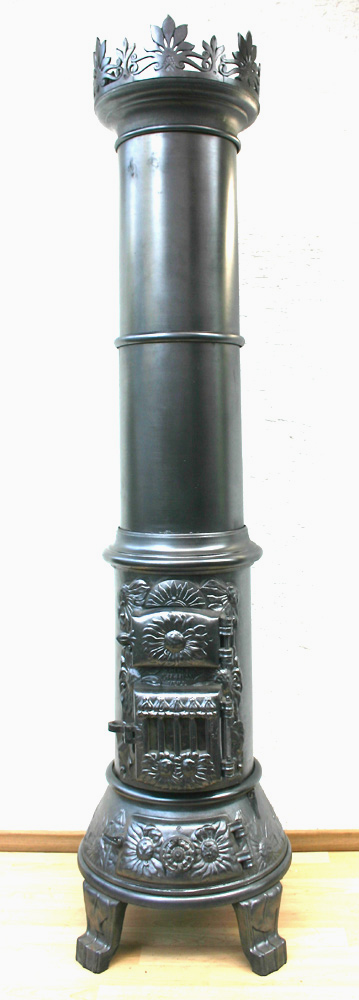 Der schlichte Säulenofen Eneret C.M. Hess Veile Dänemark ist mit dezenten Sonnenblumen verziert. Seine Krone dagegen wirkt sehr majestätisch. Auch in modernem Ambiente kommt er gut zur Geltung.