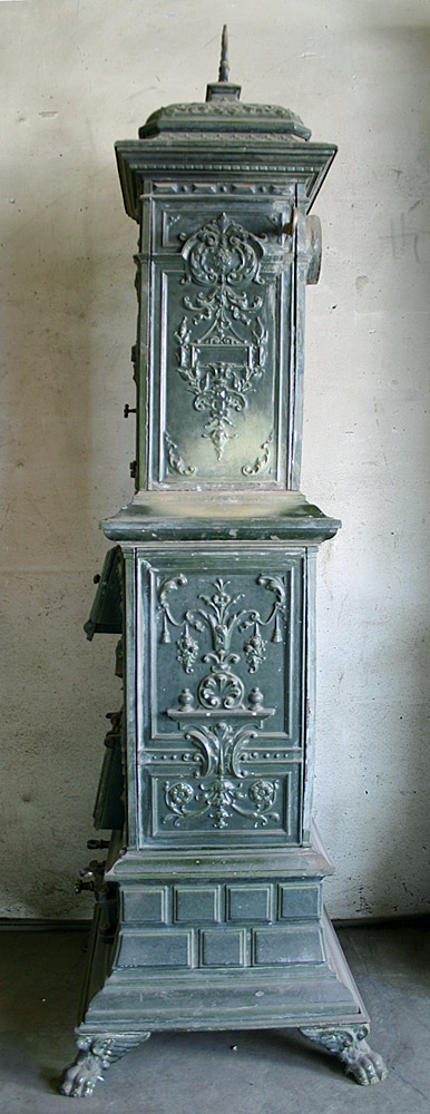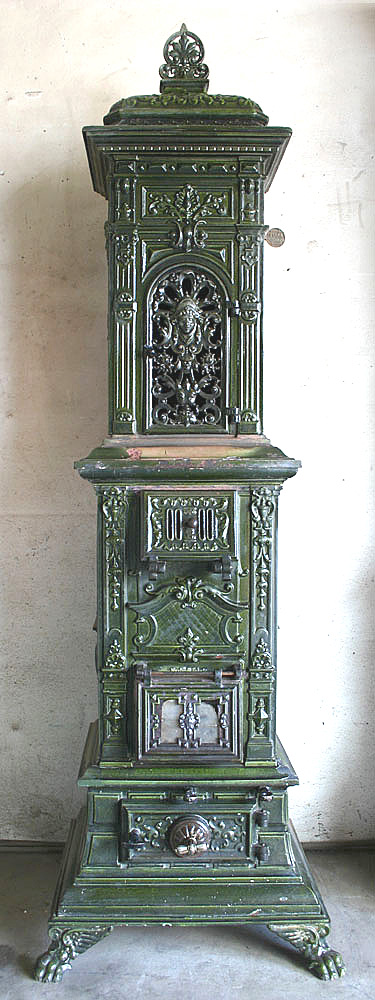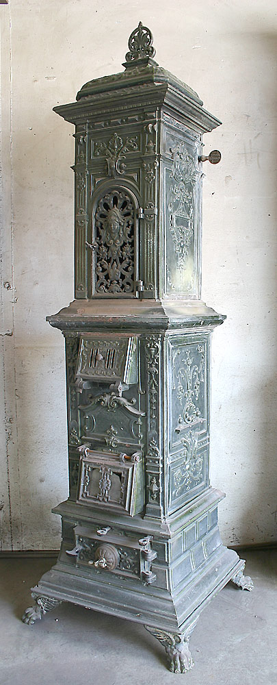 Dieser elegante deutsche Prunkofen, ein Füllregulierofen mit Kochfach, wurde um 1890 gegossen. Die verspielte Ornamentik ist typisch für seine Zeit .