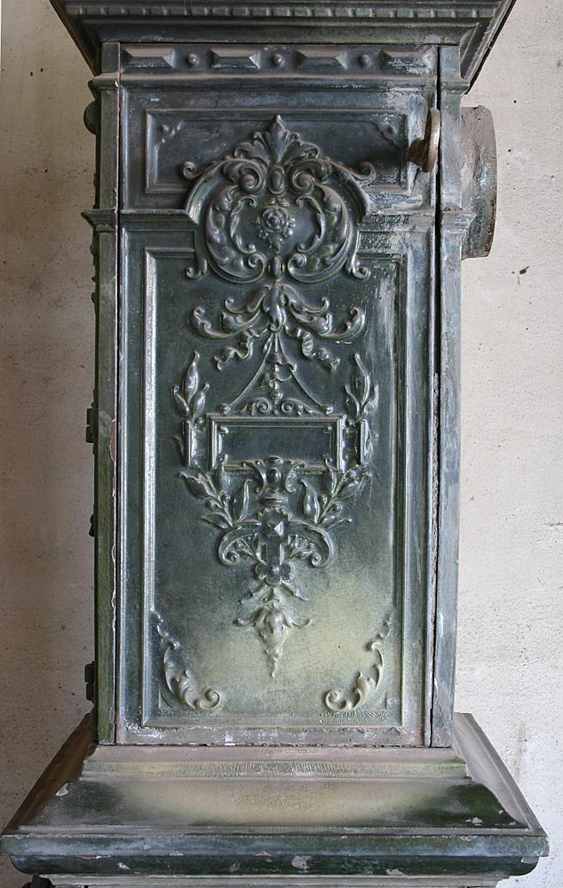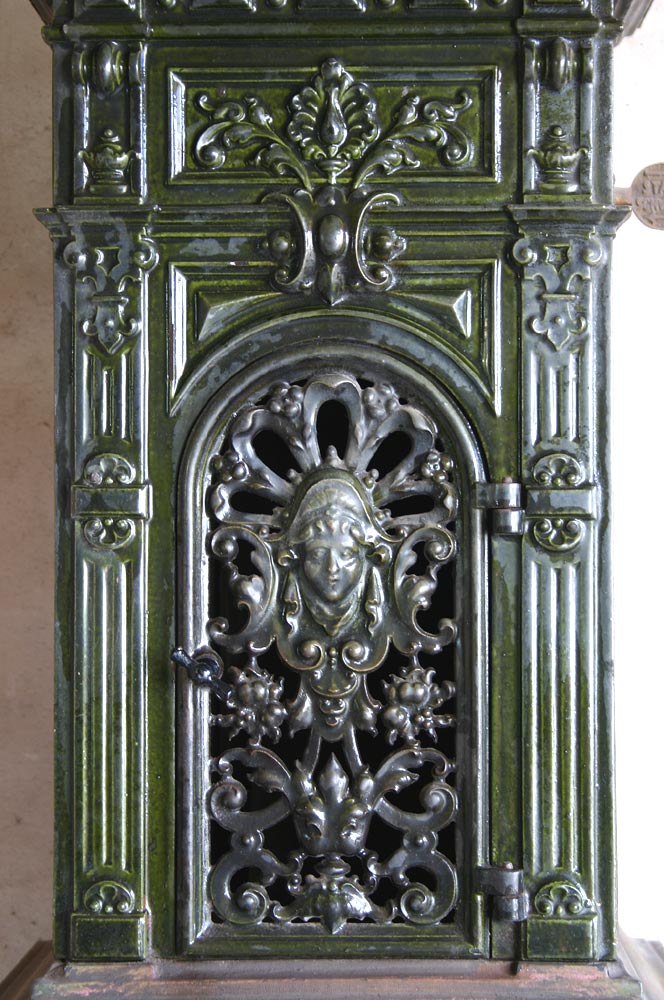 Der Ofen ist zur Zeit noch unrestauriert. Die dunkelgrüne Emaillie ist an einigen Stellen heller geworden. Nach der Restauration ist dies kaum noch zu sehen.